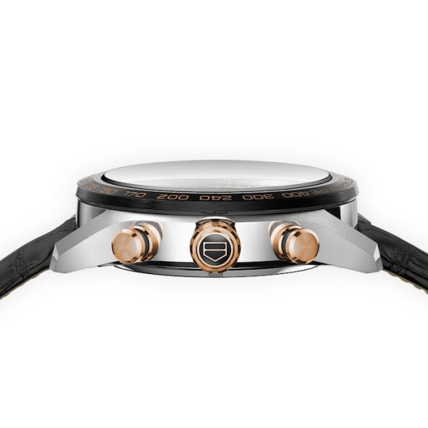 Replica TAG Heuer Carrera Mens Watch features a 44mm stainless steel, ceramic, and rose gold coloured case, showcasing a black dial and crystal glass. Powered by an automatic movement, this stunning watch also showcases a leather strap finished with a deployment clasp for added security. This timepiece is also water resistant to 100 metres.